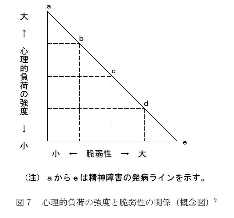 ストレス-脆弱性理論は、環境由来の心理的負荷(ストレス)と、個体側の脆弱性等との関係で精神的破綻が生じるかどうかが決まり、心理的負荷(ストレス)が非常に大きければ個体側の脆弱性が小さくても精神的破綻が起こるし、脆弱性が大きければ、心理的負荷(ストレス)が小さくても破綻が生ずるとする考え方です。